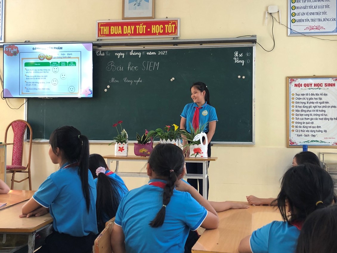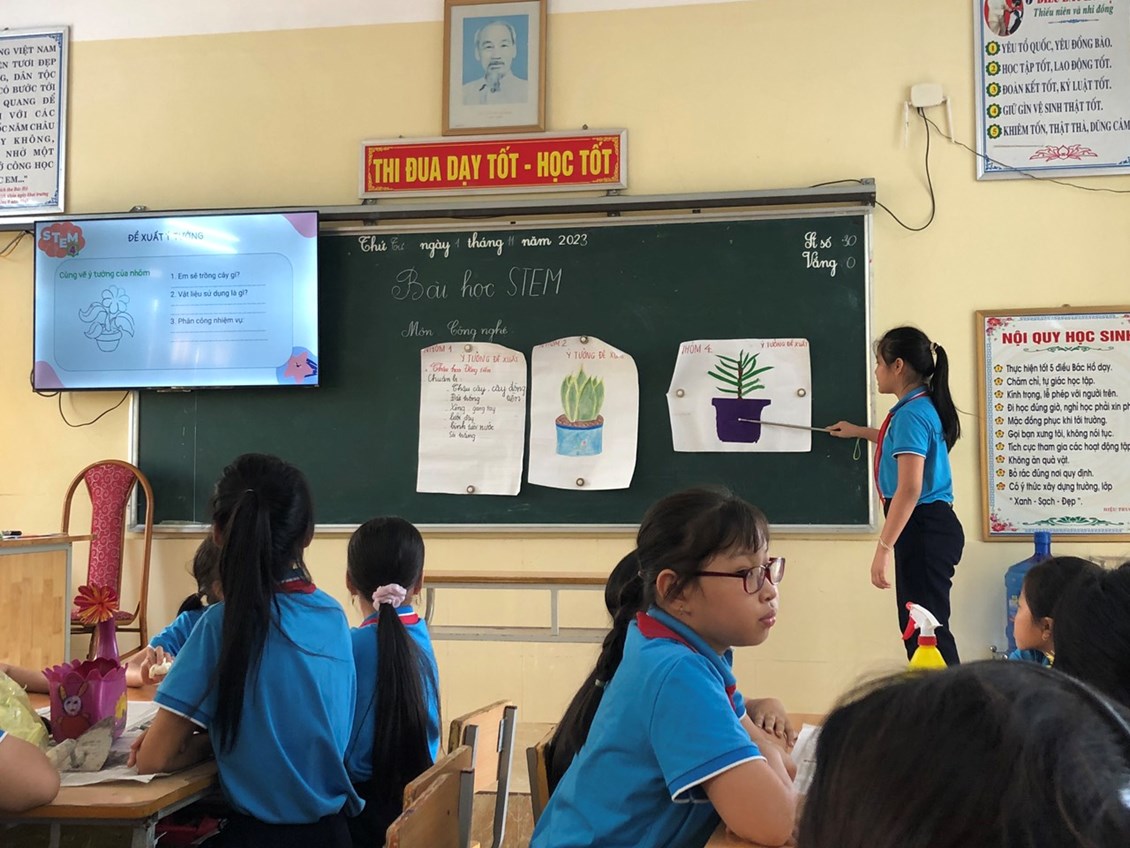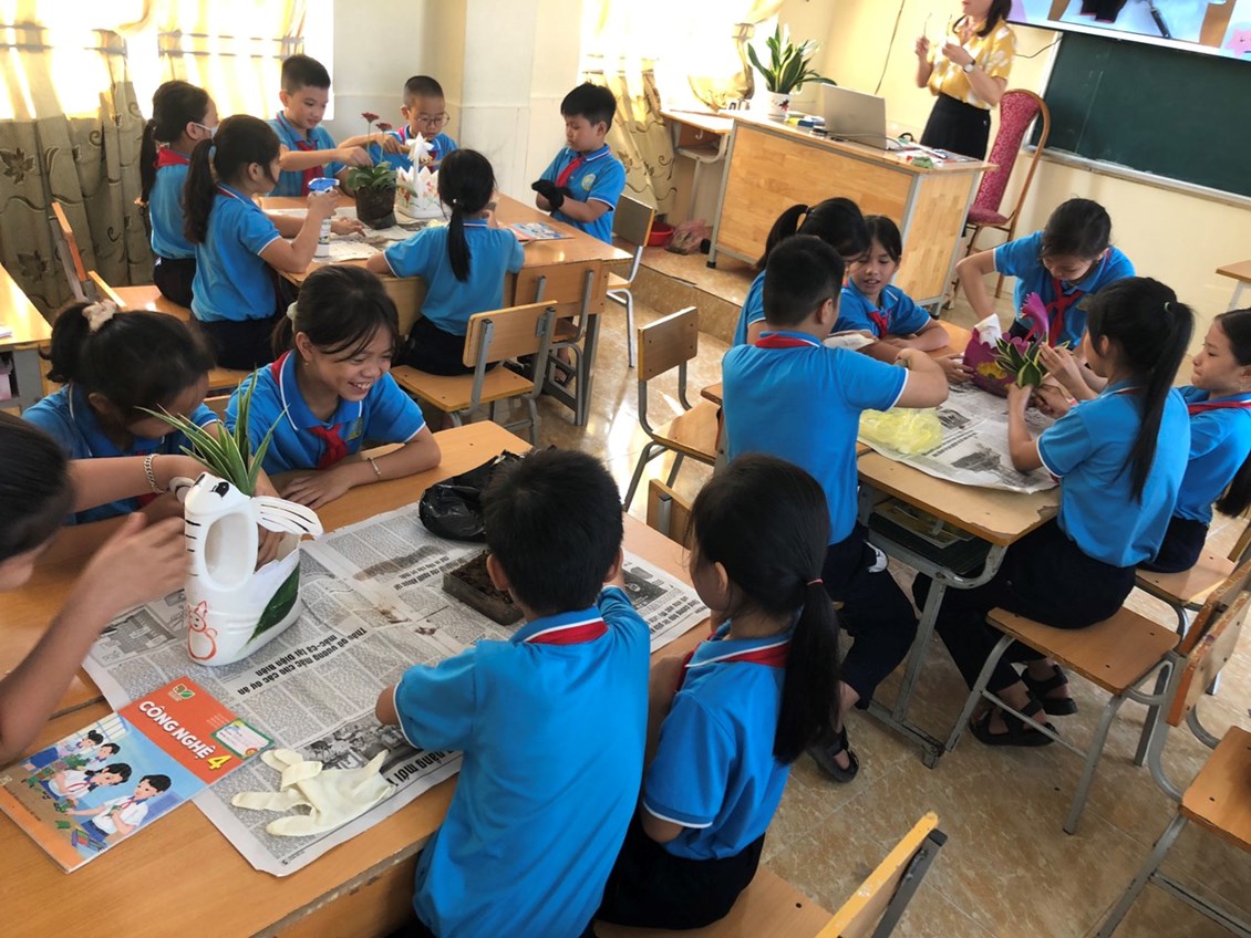 Các em được xem video về quy trình trồng hoa, cây cảnh, sau đó các em được làm việc theo nhóm với sách giáo khoa, kiến thức nghiên cứu trong từ internet, định hướng của giáo viên,... để thiết kế bản mô phỏng chậu hoa của nhóm mình. Học sinh tích cực tham gia thiết kế, tiếp nhận ý kiến góp ý, hoàn thiện bản vẽ và tiến hành tạo ra các sản phẩm chậu hoa khác nhau. Sau đó các em trồng hoa, cây cảnh vào chiếc chậu vừa mới tạo được. Các em lớp 4A tích cực chia sẻ, đánh giá sản phẩm của mình và nhóm bạn từ đó đề xuất ra những phương án điều chỉnh thiết kế, điều chỉnh lớp lọc, tiện ích của sản phẩm,... nhằm hướng tới hoàn thiện sản phẩm tốt hơn.