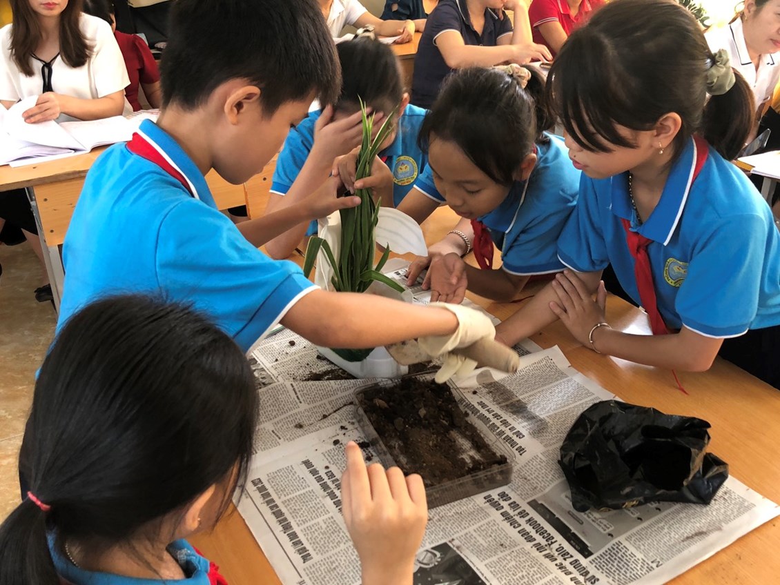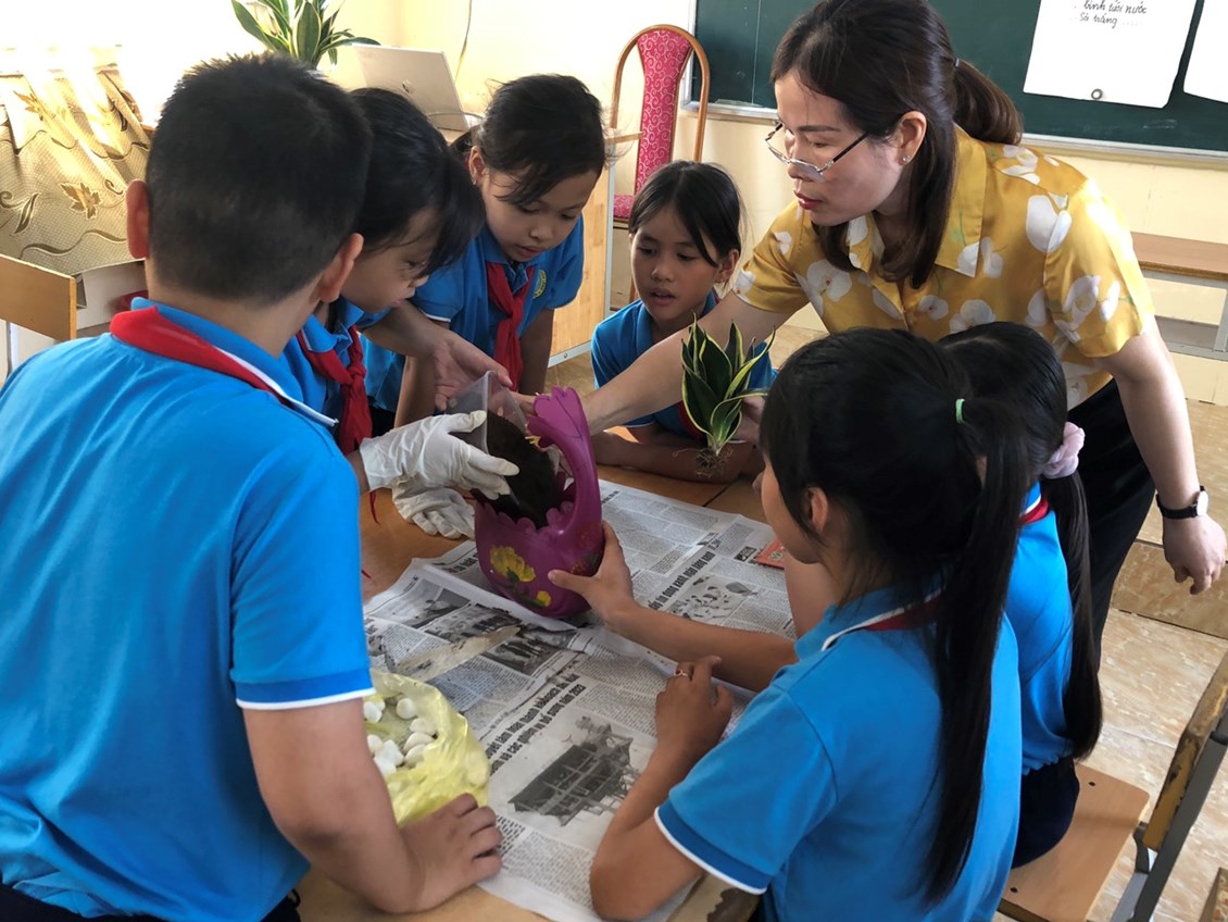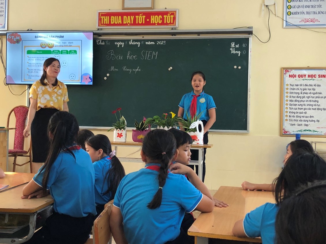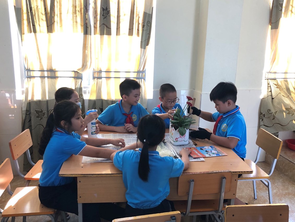 Các em được xem video về quy trình trồng hoa, cây cảnh, sau đó các em được làm việc theo nhóm với sách giáo khoa, kiến thức nghiên cứu trong từ internet, định hướng của giáo viên,... để thiết kế bản mô phỏng chậu hoa của nhóm mình. Học sinh tích cực tham gia thiết kế, tiếp nhận ý kiến góp ý, hoàn thiện bản vẽ và tiến hành tạo ra các sản phẩm chậu hoa khác nhau. Sau đó các em trồng hoa, cây cảnh vào chiếc chậu vừa mới tạo được. Các em lớp 4A tích cực chia sẻ, đánh giá sản phẩm của mình và nhóm bạn từ đó đề xuất ra những phương án điều chỉnh thiết kế, điều chỉnh lớp lọc, tiện ích của sản phẩm,... nhằm hướng tới hoàn thiện sản phẩm tốt hơn.